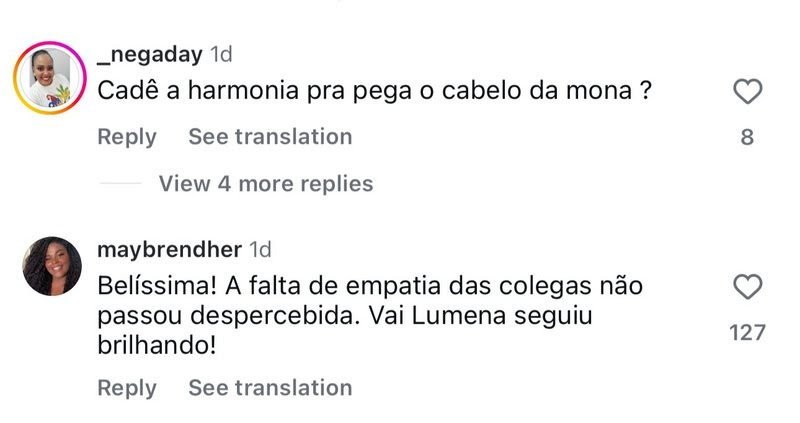 Logo após a circulação dos vídeos, usuários das redes sociais questionaram a atitude da musa. Entre os comentários, surgiram frases como “Cadê a harmonia pra pegar o cabelo da mona?” e “A falta de empatia das colegas não passou despercebida”. A partir disso, interpretações sobre suposta falta de solidariedade ganharam espaço online.