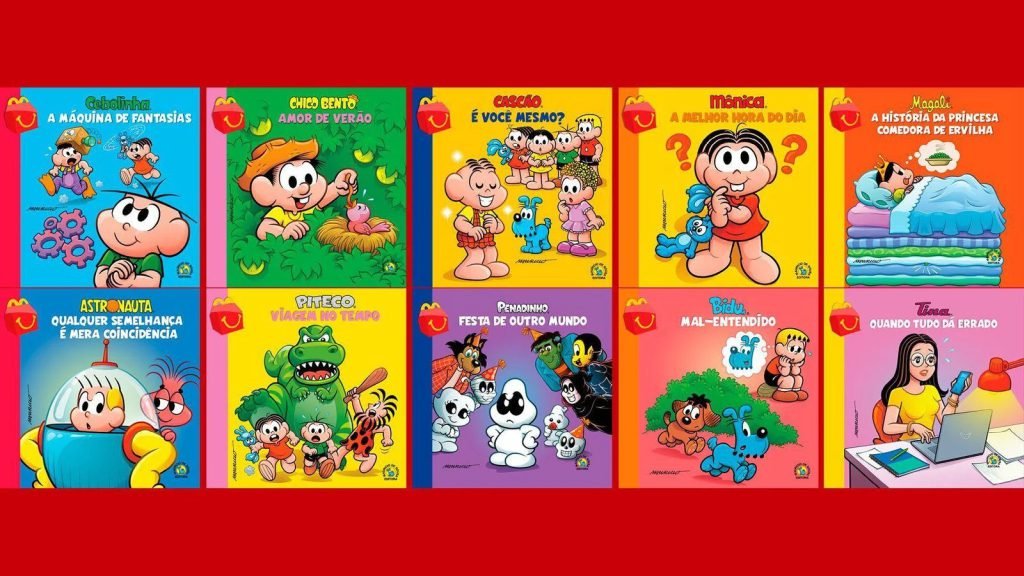 O McDonald’s retoma a iniciativa “Ler e Brincar”, permitindo que clientes escolham entre um livro ilustrado ou um brinquedo na compra do McLanche Feliz. Os exemplares contêm histórias exclusivas da Turma da Mônica, criadas pelos estúdios de Mauricio de Sousa.