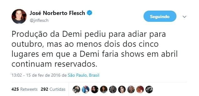 O jornalista José Norberto Flesch, que anunciou a passagem da turnê “Future Now” de Demi Lovato e Nick Jonas pelo Brasil, revelou em sua página do Twitter que a excursão foi adiada para outubro no país. Previamente marcada para chegar no país em abril, a série de shows ainda está garantida em todas as cidades anunciadas anteriormente: São Paulo, Rio de Janeiro, Brasília, Recife e Belo Horizonte.